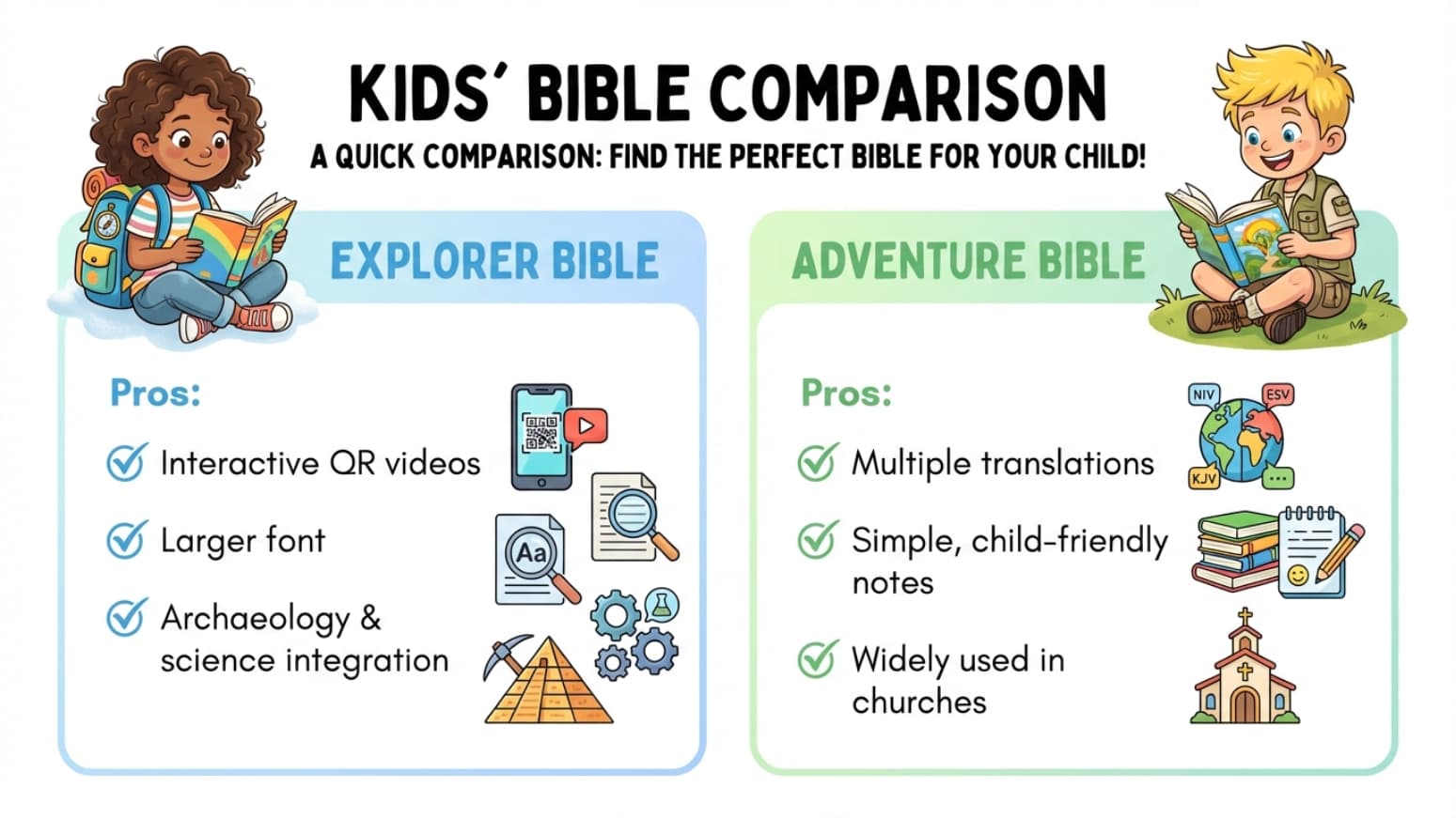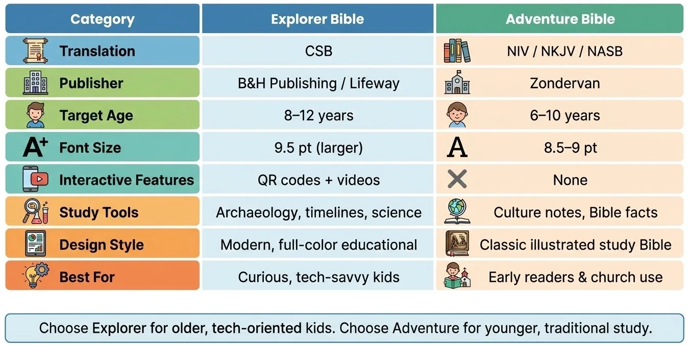 Explorer Bible vs Adventure Bible — a detailed comparison of translations, features, study tools, and age suitability to help parents choose the best Bible for kids.